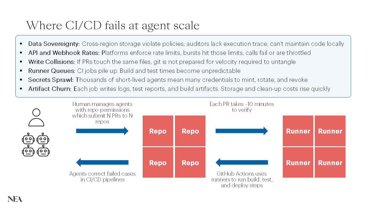 As AI workloads increasingly dominate the percentage of total workloads, CI/CD has become one of the largest, least‑optimized line items in the infrastructure budget for AI‑heavy and microservices‑heavy organizations. The answer isn't a faster pipeline — it's a fundamentally different primitive. Agents and developers need on-demand, high-performance compute environments purpose-built for building and shipping software, not a queue of sequential steps designed for a handful of daily pull requests.